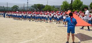 運動会の練習が始まりました!第1回目の全体練習は、あいにくの雨模様でしたので、体育館で行いました。