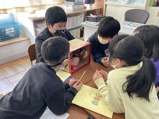 ★「What's this (これは何ですか?)」のフレーズを使って、「はてなボックス」の中のものを当てています。箱の中にはフルーツが10種類入っています。箱に手を入れた大沼っ子が「orange!(オレンジ)」「pineapple!(パイナップル)」など、手の感触を頼りに答えていました。見ている子たちに「That’s right!(正解!)」と言ってもらえると、とてもうれしそうでした。