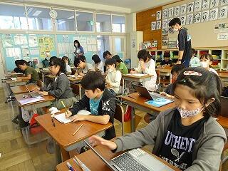 どのクラスでも集中してタブレットで自分の考えをまとめていました。
