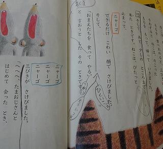本校では、先生方の研修として、校内での授業研究会を実施しています。今回は2年生の取り組みを紹介します。2年生は、国語の物語文「ニャーゴ」の学習です。学習内容はネコの「ニャーゴ」と子ネズミの「ニャーゴ」「ニャーゴ」「ニャーゴ」をどう工夫して読むか考えて音読するでした。
