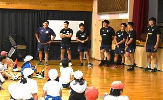 ★ラグビー教室の前半は、選手のみなさんから話を聞いたり、クイズをしたりしました。