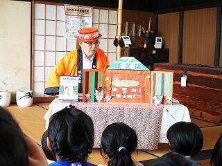 本校の2年生は、生活科の学習単元「どきどき わくわく まちたんけん」の発展として、地域に住む紙芝居作者の方を招いて、紙芝居「泉が森の霊玉」「三本杉の天狗」「ぶったたきと半ごろし」という、日立市の民話を紙芝居に仕立てたものを披露していただきました。
