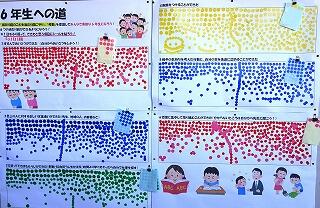 ★「6年生への道」と題して、めあて「当たり前のことを当たり前にできる6つの約束」が達成できたか、シールを貼って「見える化」しています。毎日下校時に、その日を振り返ってできた項目にシールを貼ります。