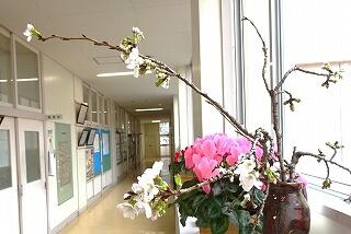 枝を切ったサクラは、校長室前の廊下に花瓶に入れてあります。