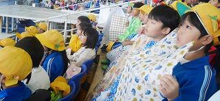 ★大沼小2年生は水かぶりのプールに近い席でした。レジャーシートを広げて準備OK!