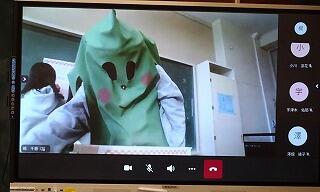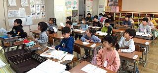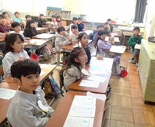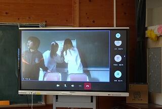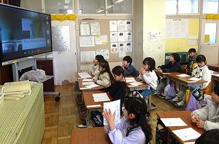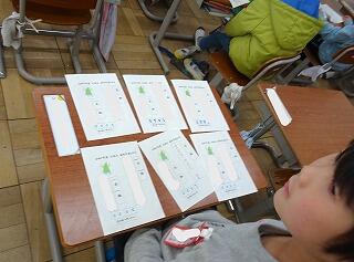 机に届いた年賀状を置き、電子黒板の画面を真剣に見つめます!